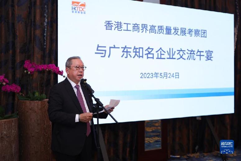 5月24日,香港貿易發展局主席林建岳在廣州市參加交流午宴時發言。新華社發