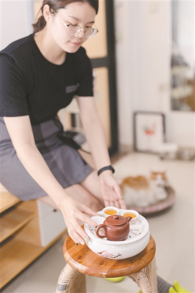 林婷玉在公租房內喝功夫茶。