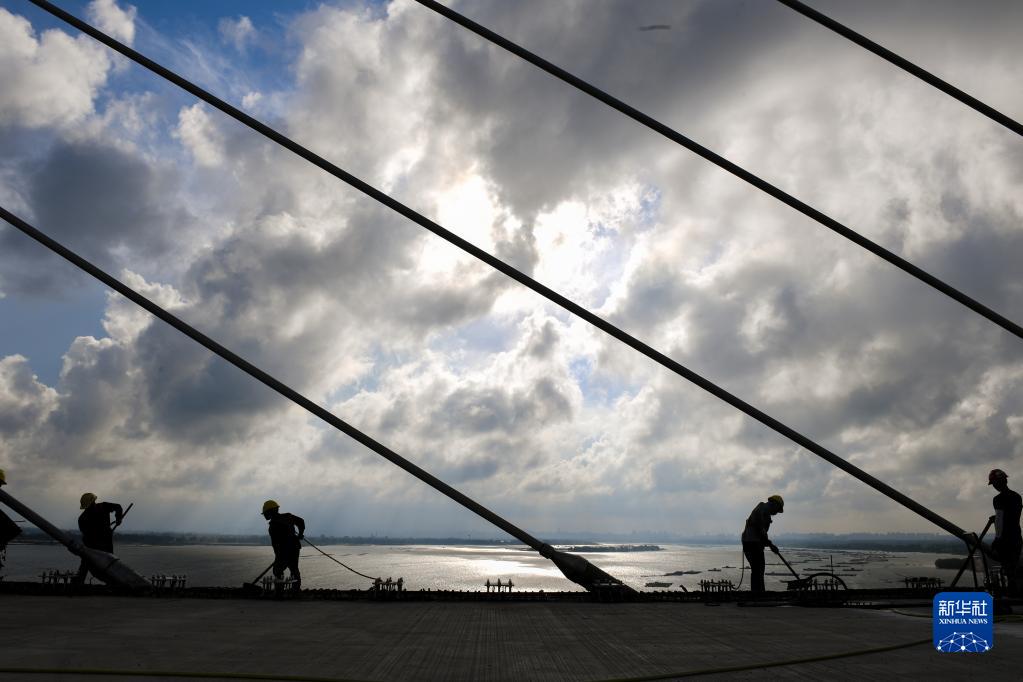 5月25日,建筑工人在鷺洲大橋修筑橋面。新華社記者 盧漢欣 攝
