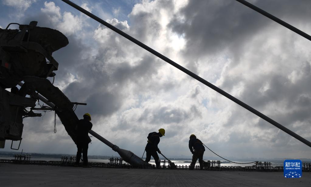 5月25日,建筑工人在鷺洲大橋修筑橋面。新華社記者 毛思倩 攝