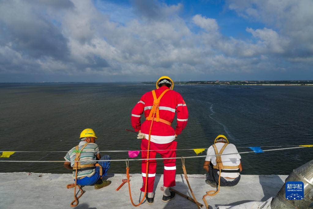 5月25日,建筑工人在鷺洲大橋上進行施工。新華社記者 盧漢欣 攝