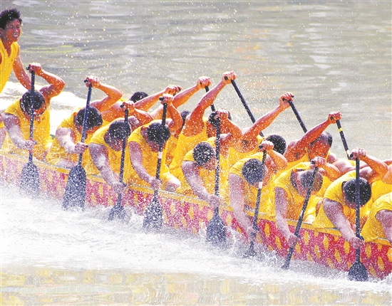 忽然間,河面熱鬧起來。響亮的號子此起彼伏,河畔的人群大聲吶喊起來。隨著幾艘龍舟出現,河水仿佛沸騰起來,原本碧石樣的水被船頭劈開,分成兩片向船兩側翻滾而去;船槳劃破的水面,水花濺起飛向船尾。河畔云旗獵獵,河中雷鼓嘈嘈,這里成了“龍”的演武場。金黃白赤乘風破浪,紅藍烏翠張牙舞爪。錦旗林立,鼓聲赫赫,群情激昂,歡聲震天,水上水下熱鬧非凡、氣象萬千。
