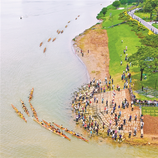 “閏月風光三月景,二分煙水八分人?!睒窂凝堉勖看渭Y都是一場盛會。鮮紅的木棉花倒映在碧綠的河水上,水波浮動。河岸邊的人群或坐著或蹲著,有樂事者在綠地上打上天幕坐在其中,男女老少談笑風生。堤岸邊,人頭攢動,人們尋找著最佳觀測點。當比賽響鑼,岸邊的人站起來、跳起來,堤岸上人們扒在欄桿上,齊刷刷地望向河面。
