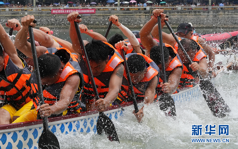 伴隨著鏗鏘有力的鼓聲,整齊劃一的劃槳節奏越來越快,平靜的墨江兩岸瞬間變成了熱鬧的海洋。新華網發 (始興縣融媒體中心供圖)
