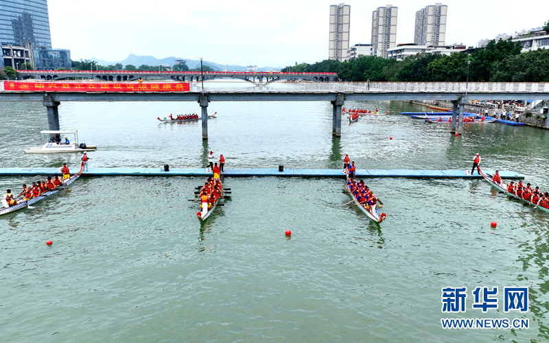 近日,2023年韶關市始興縣“鄉村振興·墨江爭渡”龍舟賽在墨江河道火熱開賽。新華網發 (始興縣融媒體中心供圖)