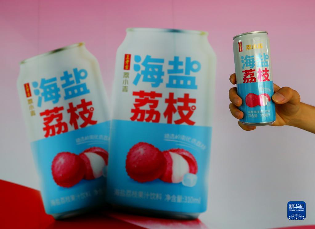 這是6月12日在廣東茂名的廣藥王老吉廣東荔枝(茂名)產業園拍攝的荔枝果汁飲料(左側為海報,右側手中為實物)。這里的荔枝清汁生產線每天可處理200噸荔枝鮮果。新華社記者 龔兵 攝
