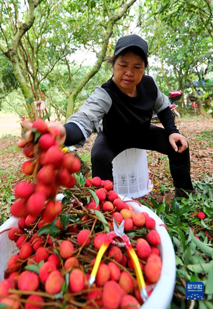 6月12日,在廣東茂名高州市根子鎮柏橋村荔枝種植園,一位果農整理剛剛采摘的荔枝。新華社記者 龔兵 攝