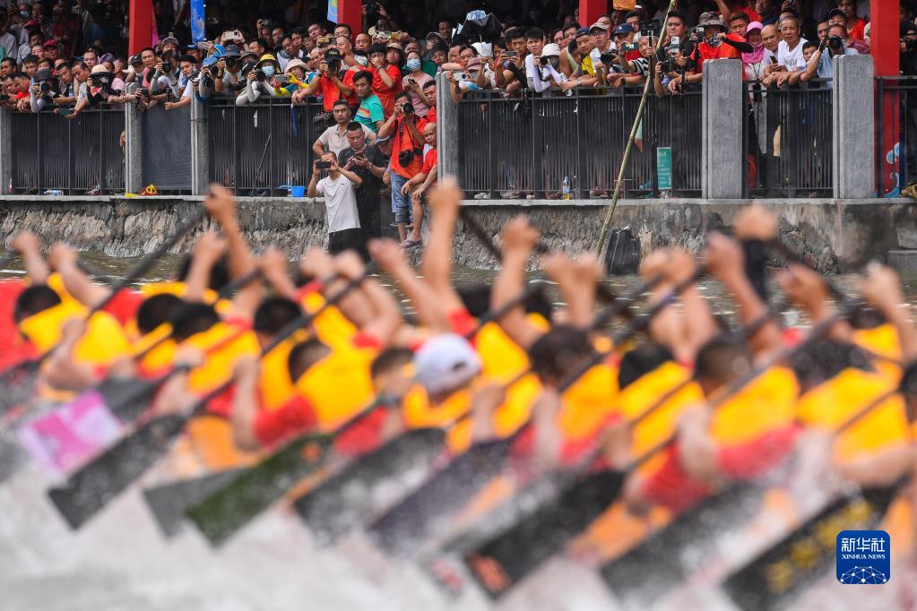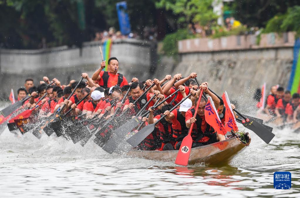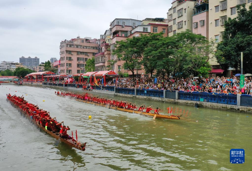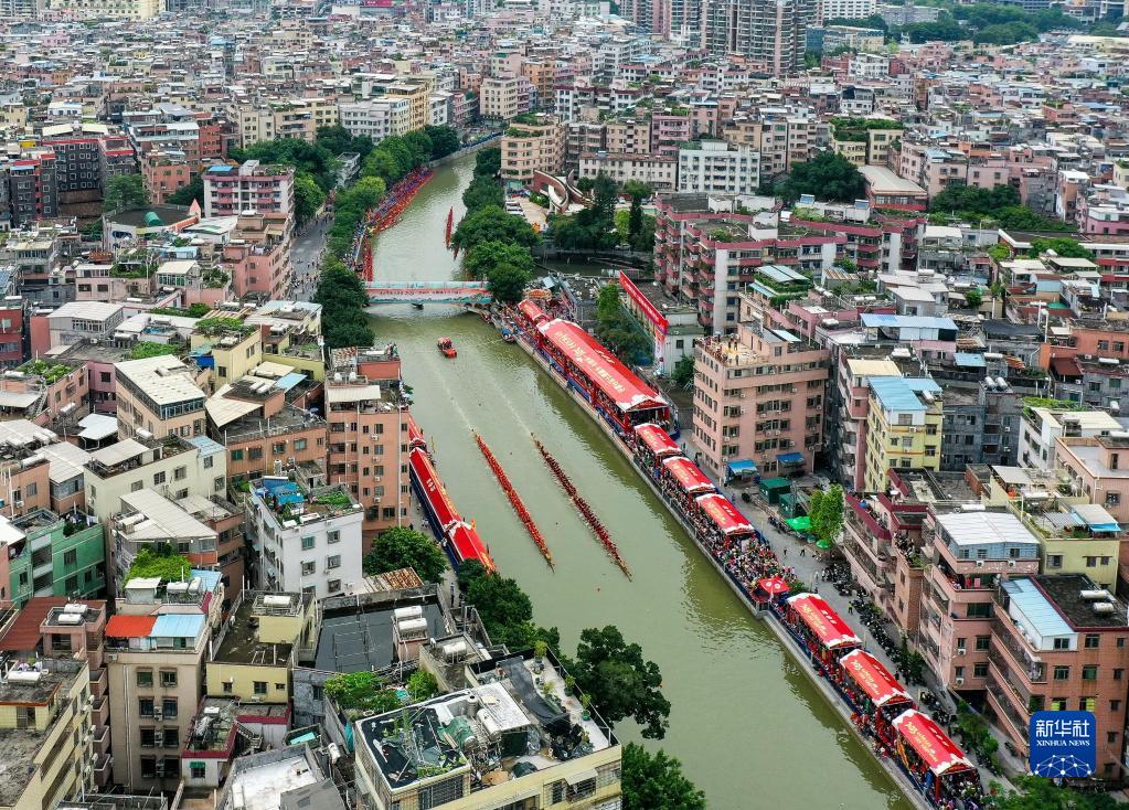 自農歷四月初八“起龍舟”開始,廣州地區就開啟了劃龍舟、迎端午的年度大戲。6月15日,車陂村12條龍船在車陂涌進行龍舟競渡。