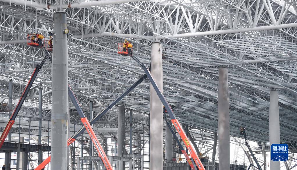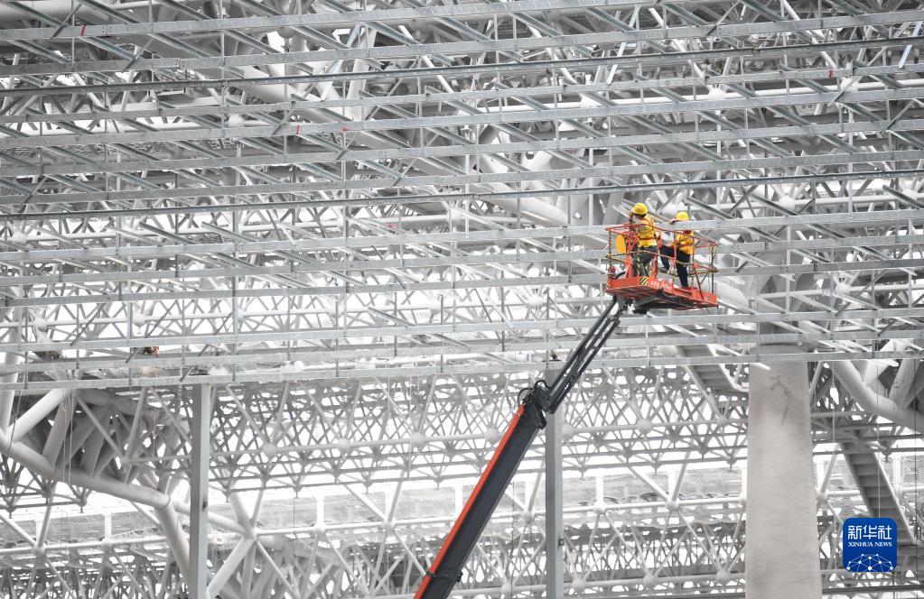 6月19日,工人在廣州白云火車站鋼結構框架上施工作業(無人機照片)。
