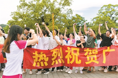 11點40分,廣東工業大學大學城校區門口早已人聲鼎沸,等待冠軍隊伍凱旋?!皬V工太酷啦!”有學生帶著球員照片和球員簽名的衣服來到現場。