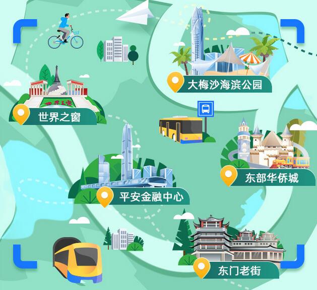 據了解,用戶在支付寶上搜索“綠色出行”,即可查全國40座城市的熱門景點地圖。以深圳為例,世界之窗、大梅沙海濱公園、平安金融中心、東部華僑城、東門老街等必去景點均包含其中。游客點擊其中任一景點,即可獲得從當前位置到達該景點的“一站式”出行規劃,包含公交地鐵、單車、網約車等多種接駁方式,省時省力。