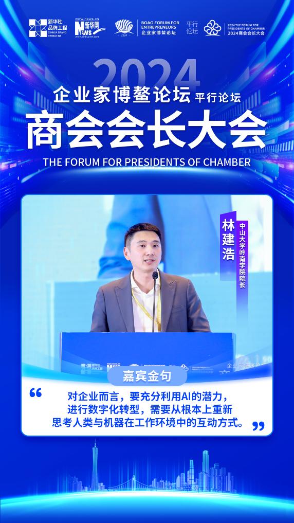 29日,2024企業家博鰲論壇平行論壇——商會會長大會在廣州舉辦。中山大學嶺南學院院長林建浩作題為“AI發展趨勢與企業AI轉型”的主旨演講。