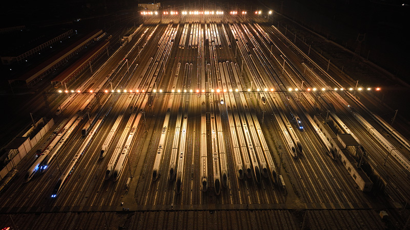 一列列完成檢修的動車組整齊地??吭诖孳嚲€上,猶如一支蓄勢待發的“陸地艦隊”,為春運提供服務。